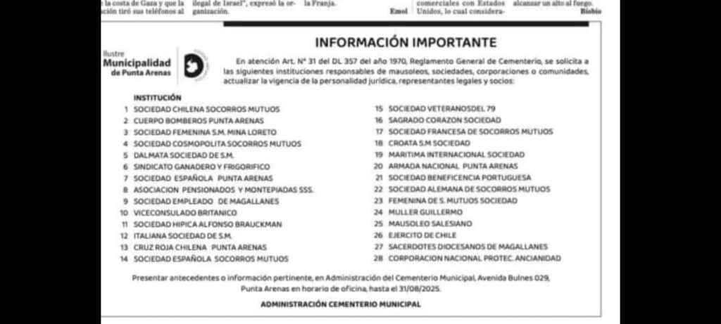 CONSULTAS:Fono: 61 2 212777 - 61 2214244E-Mail:infocementerio@e-puntaarenas.clDIRECCIÓN:Avenida Bulnes Nº 029,Punta Arenas - CHILE.